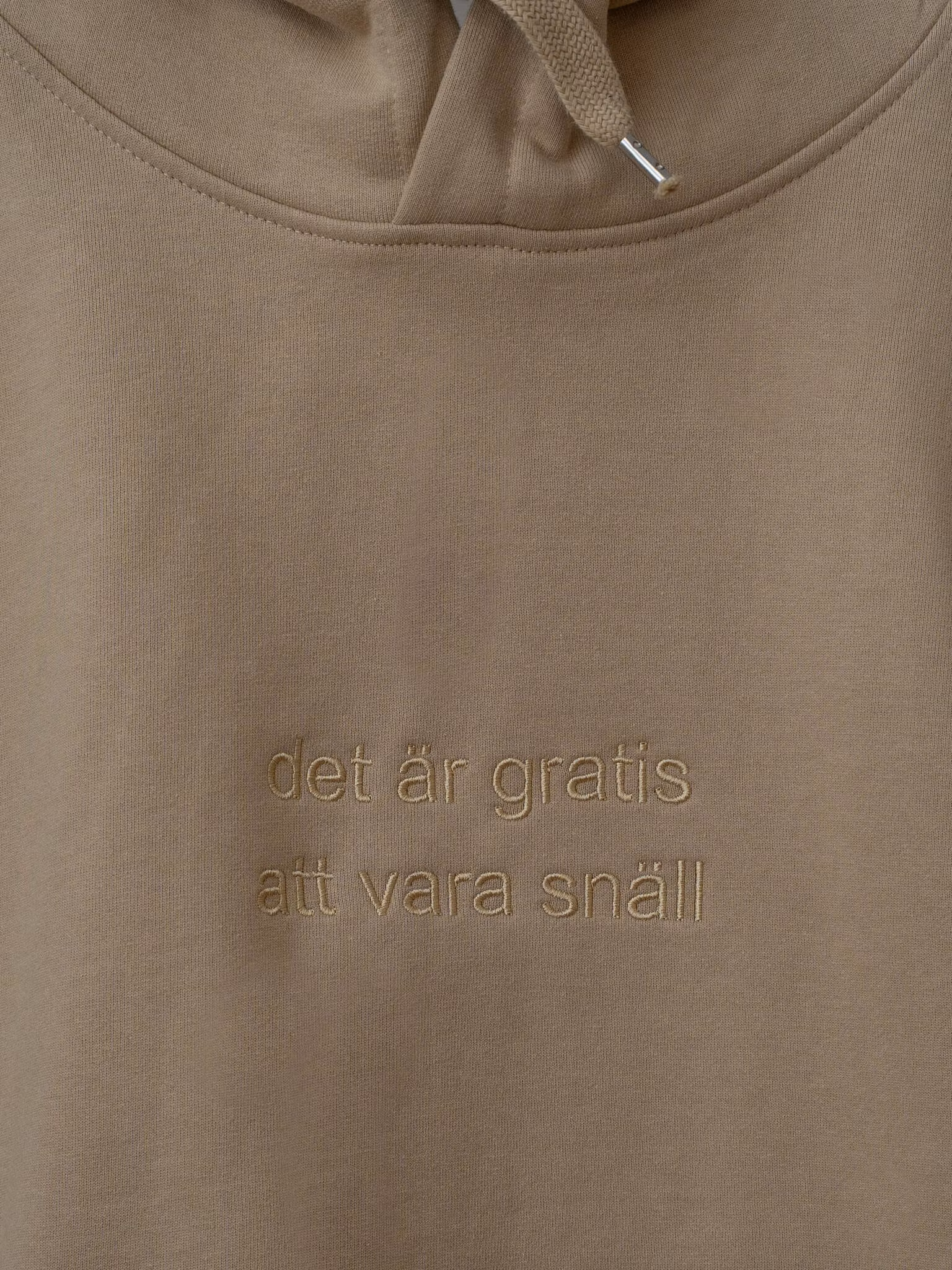 I Bror Wilhelms garderob finns tre tjocktröjor: en blå fleecetröja som han har på sig när han jobbar, en stickad tröja som han har när han går på finmiddag, och så en sån här - en klassisk huvtröja. Nu har han tagit fram en egen variant, med ett par olika citat. Just denna är beige ("som en strand" hälsar Bror Wilhelm) och på framsidan står "det är gratis att vara snäll" broderat.