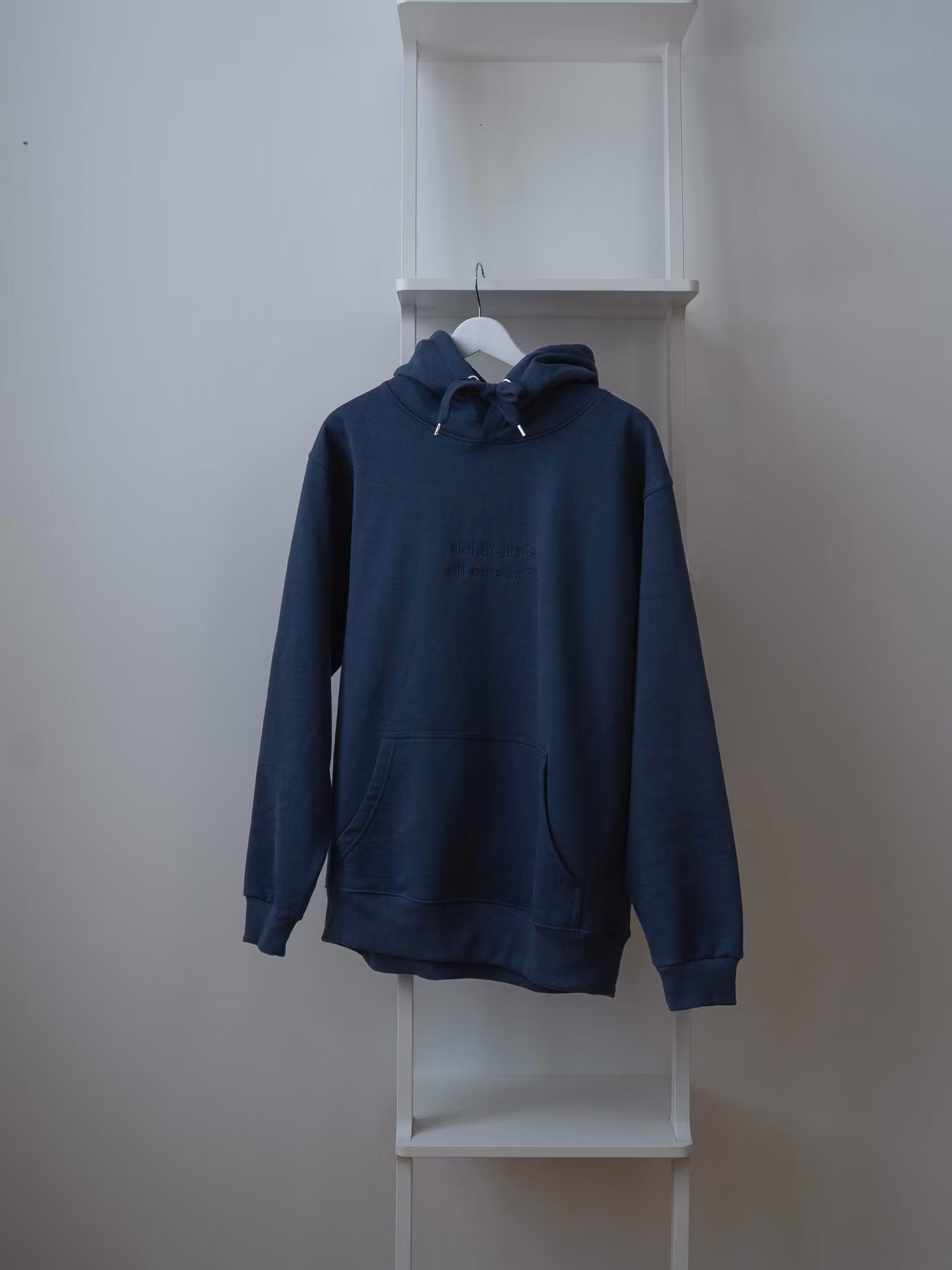 I Bror Wilhelms garderob finns tre tjocktröjor: en blå fleecetröja som han har på sig när han jobbar, en stickad tröja som han har när han går på finmiddag, och så en sån här - en klassisk huvtröja. Nu har han tagit fram en egen variant, med ett par olika citat. Just denna är mörkblå (BWs favoritfärg) och på framsidan står "det är gratis att vara snäll" broderat.