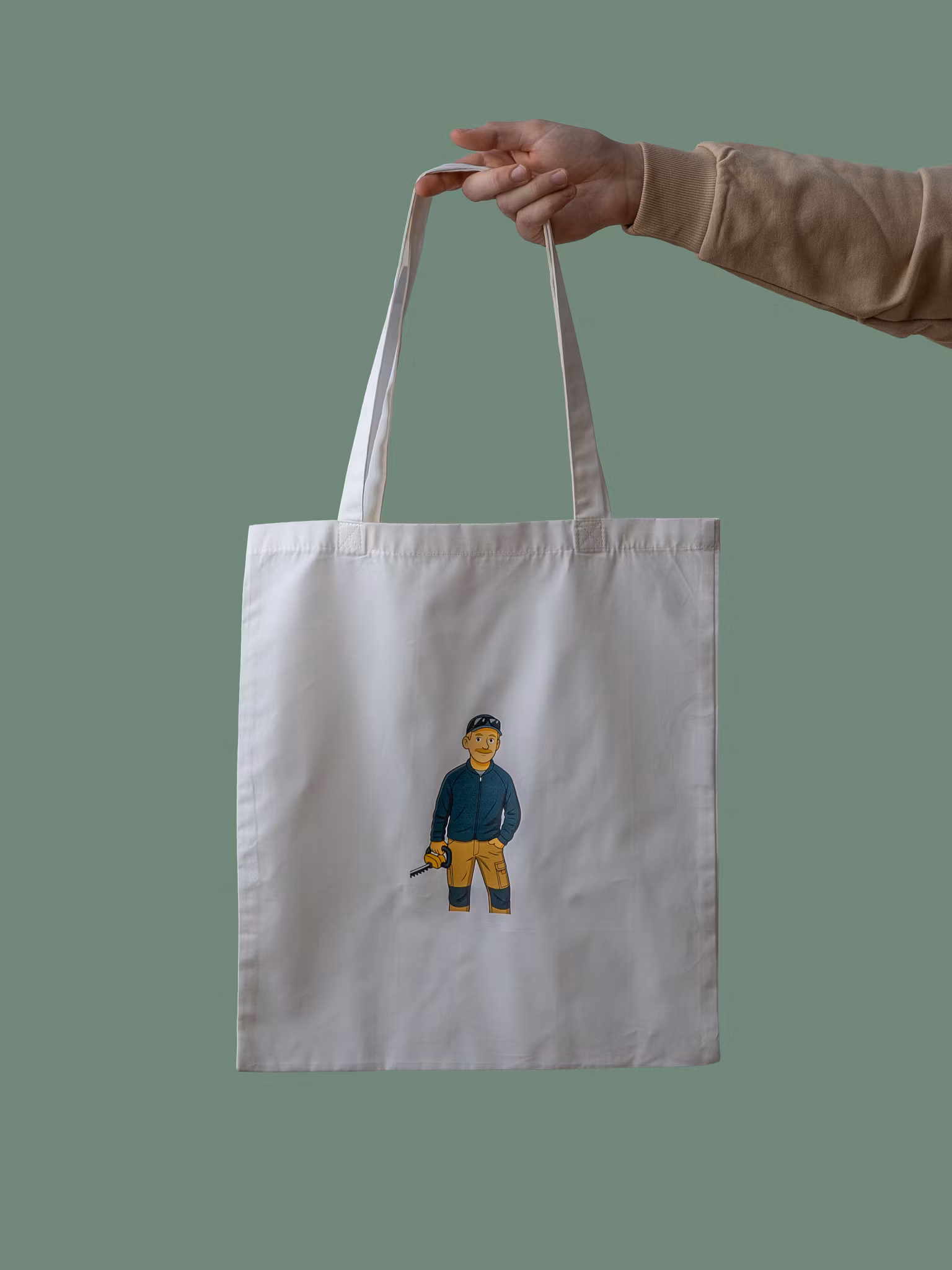 En helt vanlig vit tygpåse. Med en tecknad bild av Bror Wilhelm. "Det är väl ingen som kommer vilja gå runt med en tecknad bild av mig på en påse?" sa BW när vi tog fram påsen. Men vem vet. BW hälsar att om han ser en bild på Instagram på någon som använder påsen så skickar han sina bästa trädgårdstips i DM. Så köp nu, och få trädgårdstips på köpet!