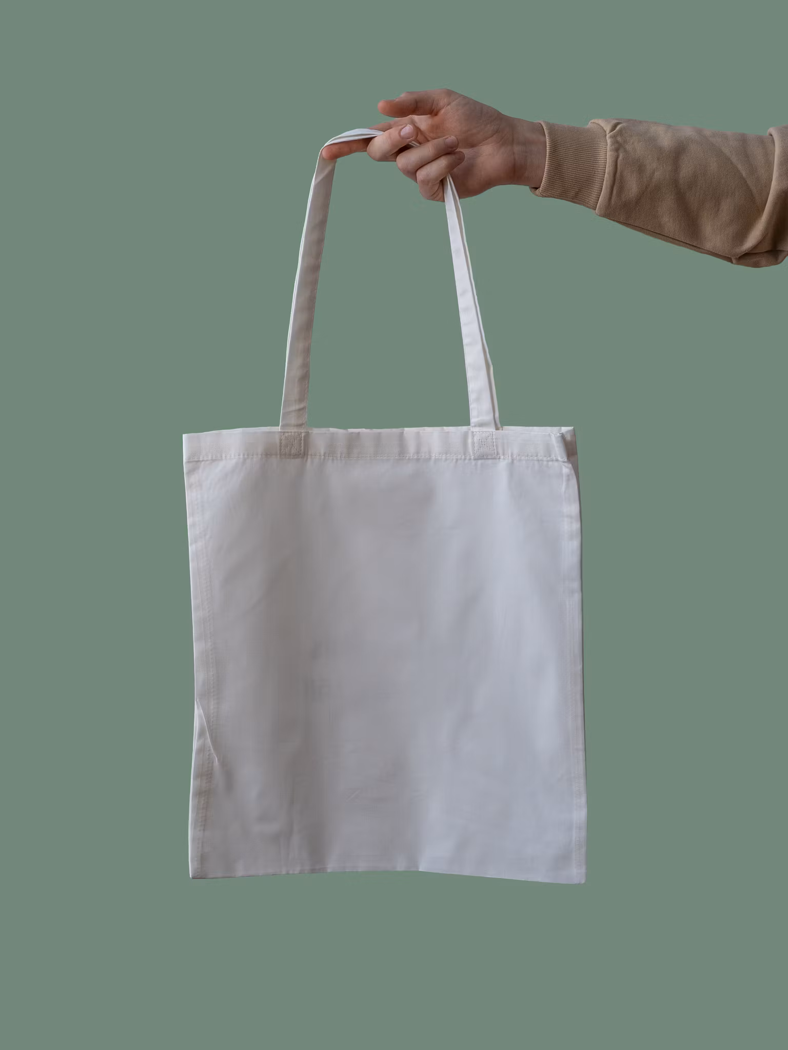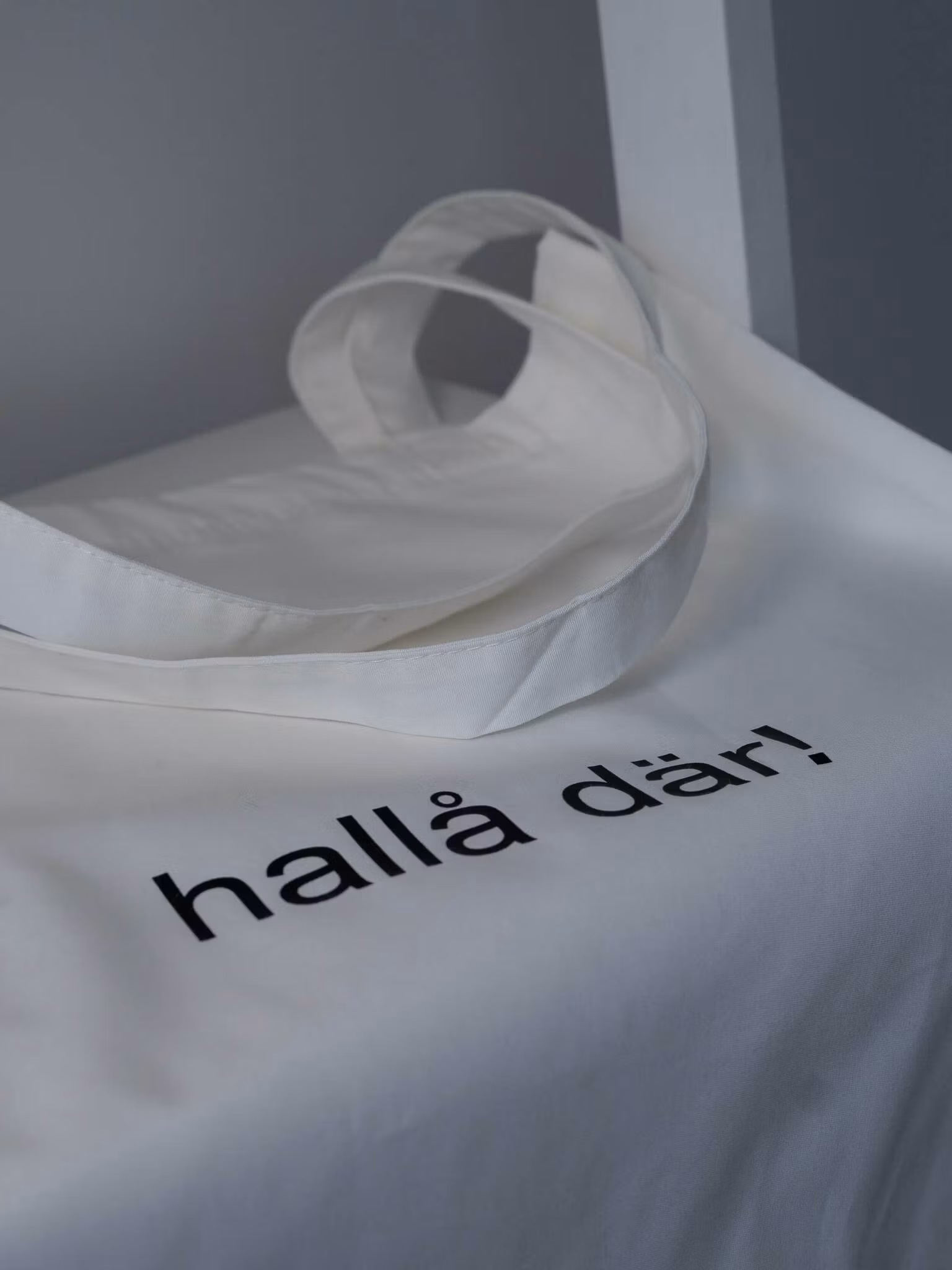 Hallå där! Här är en helt vanlig vit tygpåse. Med en... helt vanlig hälsningsfras på? Lägg din dator eller dina trädgårdsprylar i den. Du väljer själv. Slit den med hälsan.