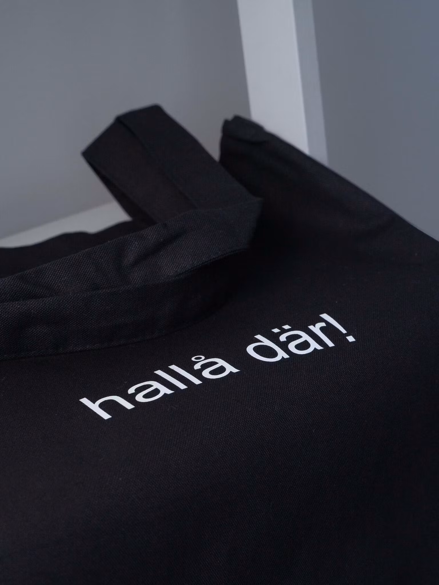 Hallå där! Här är en helt vanlig svart tygpåse. Och egentligen behöver man väl inte säga mer än så. En påse som du kan bära alltifrån din dator till din sekatör i. Bror Wilhelm, som har använt den ett tag, hälsar att den också "funkar prima när man handlar falukorv eller fiskpinnar". På framsidan står det "hallå där".